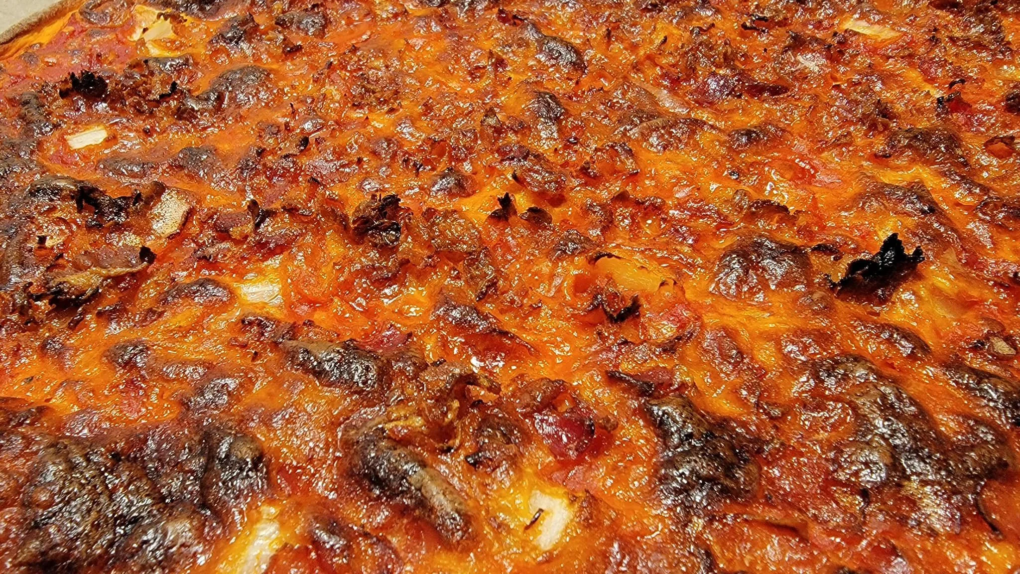 Fresh out of the oven, the undercarriage, as Portnoy pointed out, was stunning and the slice had “zero flop” I always fire up my oven before I leave home to pick up pizza and I ALWAYS ask for my pies to be uncut so that I can toss it in the oven to regain the crisp that inevitably diminishes as it steams in the box on the ride home.